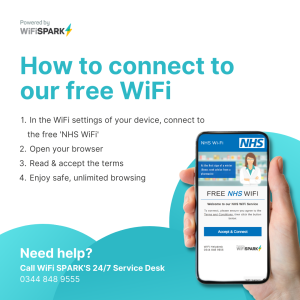This is the Trusts free Wi-Fi Service that comes with content filtering and quality broadband. To connect, you need to select ‘NHS WiFi’ from the Wi-Fi networks available.